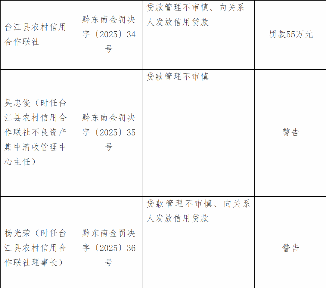 11月18日,国度金融监督责罚总局黔东南监管分局行政处罚信息公开表败露,台江县农村信用谄媚联社因贷款责罚不审慎、向干系东谈主披发信用贷款被罚金55万元;吴某俊、杨某荣、吴某华、贾某被教学。